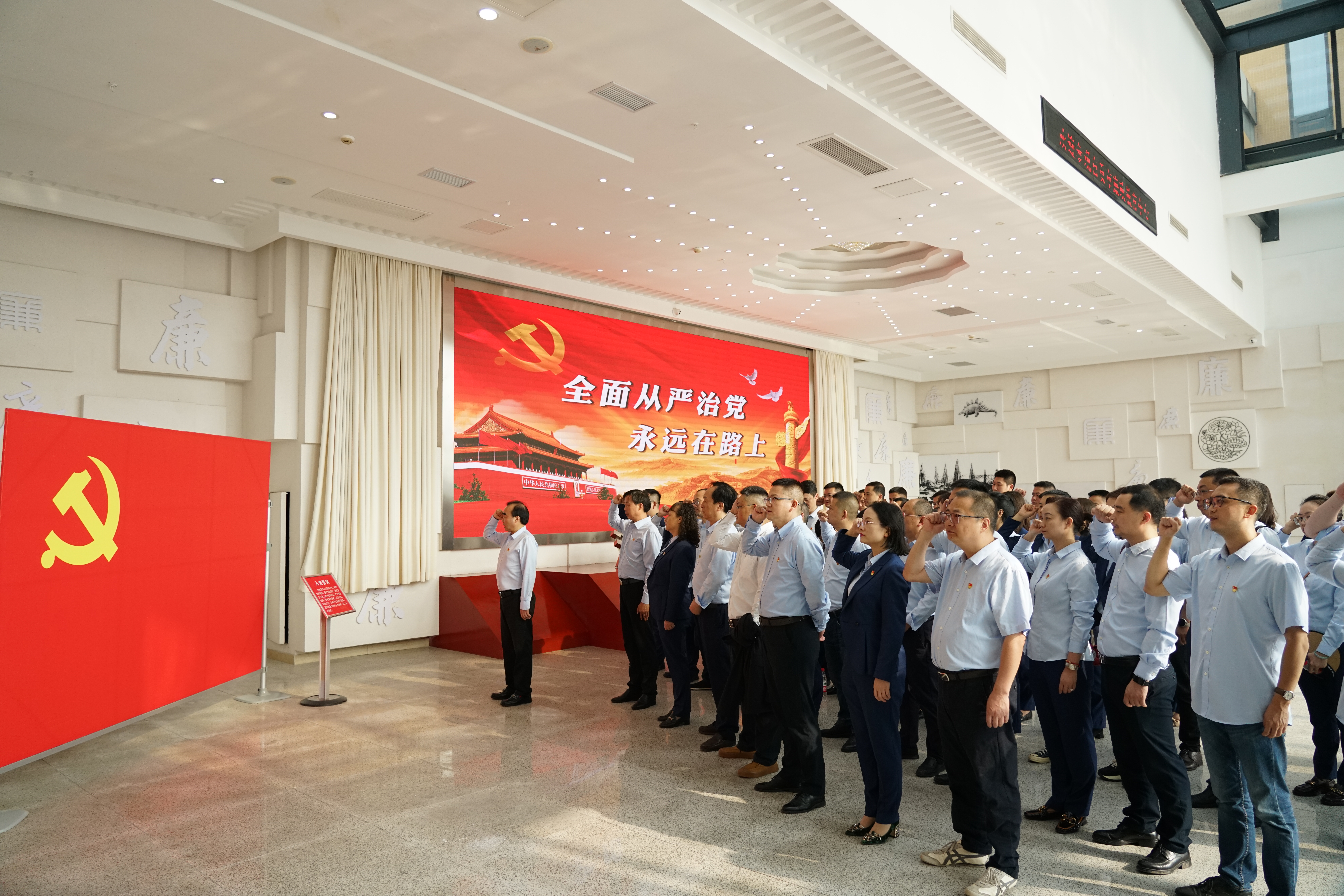 学习结束后,在鲜艳的中国共产党党旗前,行党委书记张序带领党员同志们一起重温入党誓词,提醒教育党员干部进一步坚定理想信念,牢记对党的庄严承诺,坚守初心,勇担使命。
